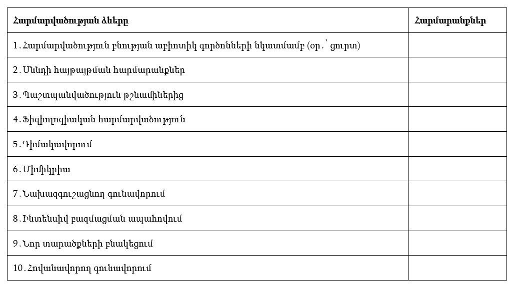 Լրացրե՛ք հարմարվածության աղյուսակը՝ օգտվելով «Հարմարանքներ» քարտ-առաջադրանքներից։
